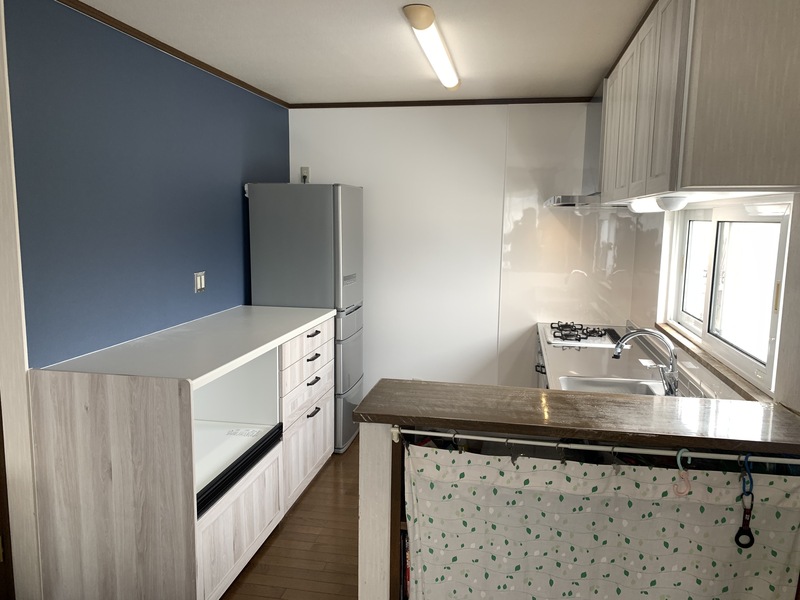 収納棚の上に、シルバー色の家電を置く予定なので、シルバーが映える壁紙の色にしました。
