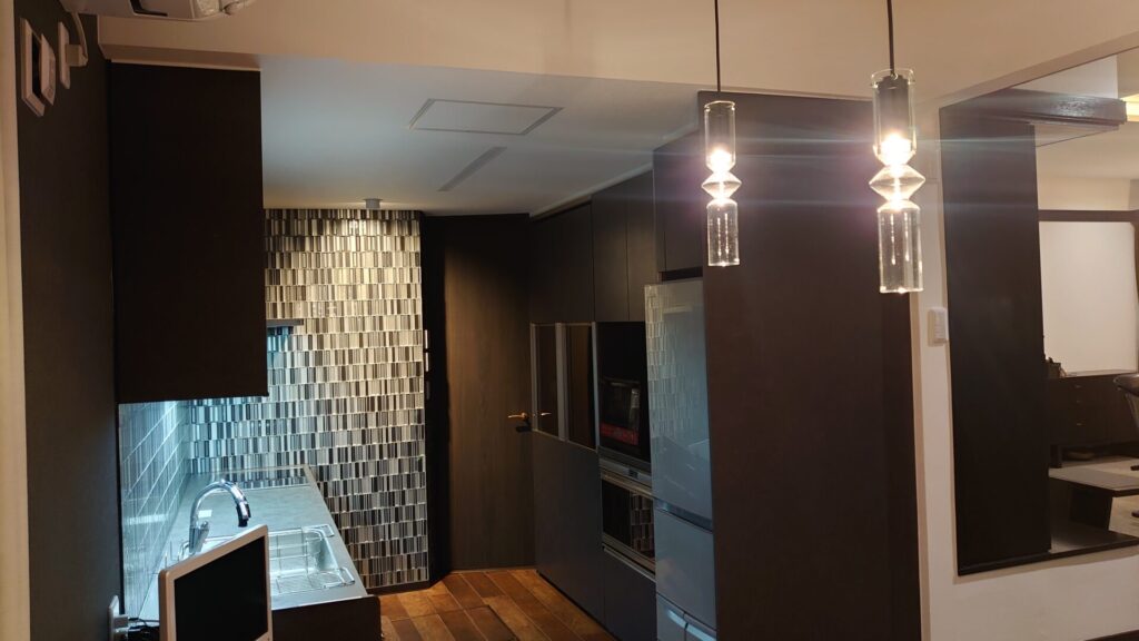 「ダイニングとキッチンの仕切り壁を取り払い空間を広くするご提案」をさせていただいたところ、気にってくださり、存在感のあるセラミックカウンターW3000のキッチンにあわせて「照明・壁紙・タイル・床」などご検討頂いた結果、リフォーム前と比べ空間を遮っていたキッチンとダイニングは明るくおしゃれに変身